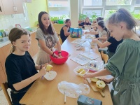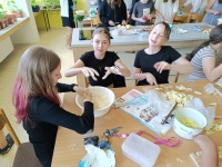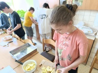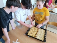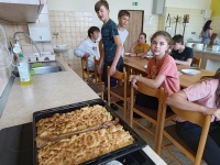 Děti pracovaly v menších skupinách podle receptu s anglickými instrukcemi a pečení si náramně užívaly. Nejlepším zážitkem však byla závěrečná ochutnávka. Koláč jsme podávali s vanilkovou zmrzlinou a všem se moc povedl.