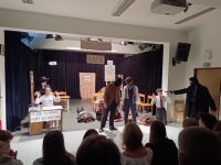 V úvodu představení nás herci vtáhli do děje ozbrojeným přepadením Springfieldské banky v Severní Americe a během těchto nezapomenutelných 70 minut nás několikrát i pořádně rozesmáli. Hru ocenili i ti, kteří se obávali, že vystoupení v cizím jazyce nebudou zcela rozumět. V závěrečném kvízu byli naši žáci odměněni za správné odpovědi na otázky týkající se obsahu hry.