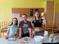 Děti pracovaly ve skupinkách podle receptu s anglickými instrukcemi a pečení je velmi bavilo. Největším zážitkem však byla závěrečná ochutnávka – koláč jsme podávali s vanilkovou zmrzlinou a všem se moc povedl.