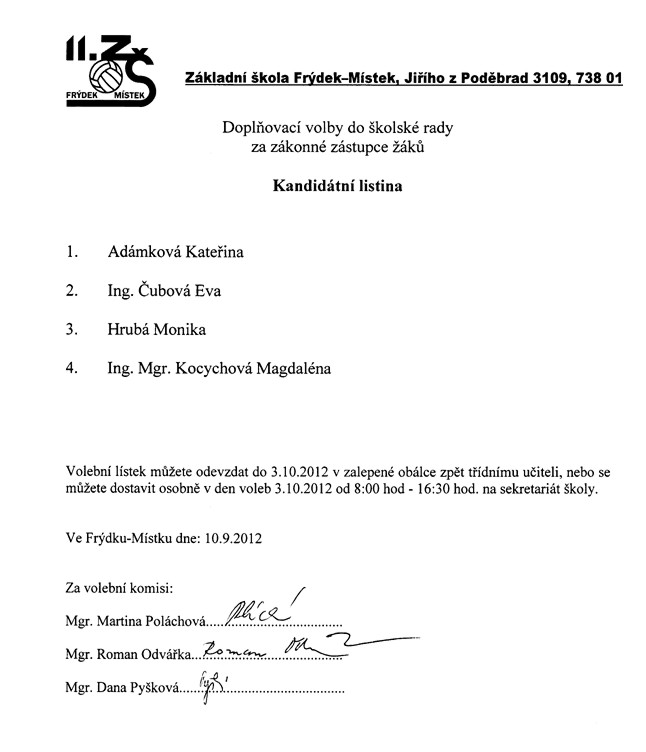 Doplňovací volby do školské rady za zákonné zástupce žáků