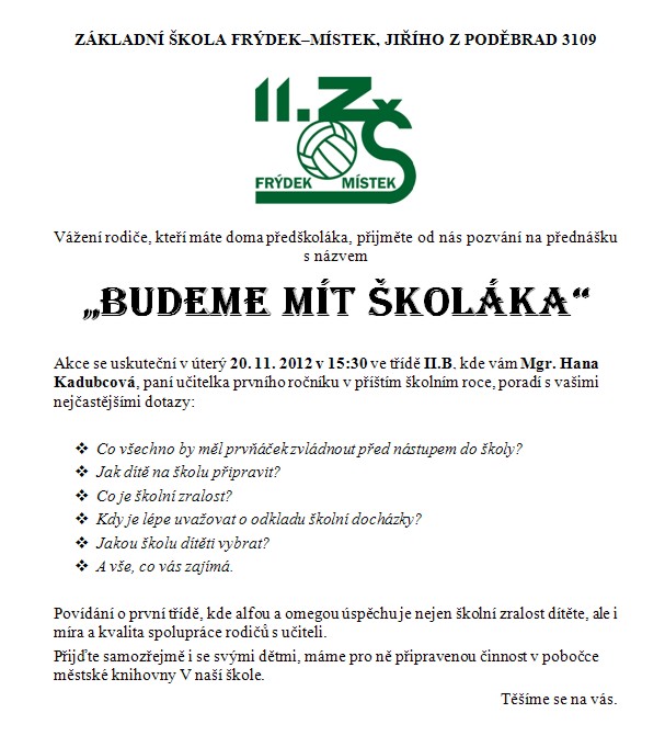 Akce se uskuteční v úterý 20. 11. 2012 v 15:30 ve třídě II.B, kde vám Mgr. Hana Kadubcová, paní učitelka prvního ročníku v příštím školním roce, poradí s vašimi nejčastějšími dotazy.