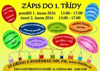 Srdečně zveme všechny budoucí prvňáčky a jejich rodiče k Zápisu do 1. ročníku, který proběhne v pondělí 1. února 2016 od 13.00 – 17.00av úterý 2. února od 13.00 – 17.00 hodin. Jako zákonní zástupci máte možnost zvolit pro své dítě školu na základě svého uvážení.