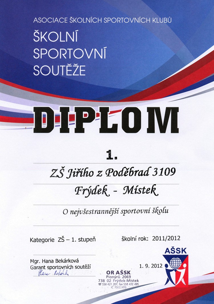 Již 5. rokem se naše škola stala suverénním vítězem v bodovaných soutěží AŠSK pro 1. stupeň ZŠ O nejvšestrannější sportovní školu za školní rok 2011/2012.