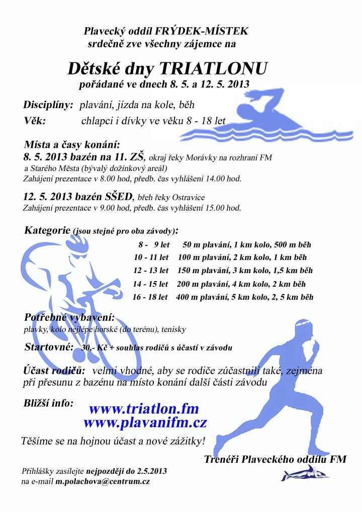 Plavecký oddíl Frýdek-Místek srdečně zve všechny zájemce na Dětské dny TRIATLONU pořádané ve dnech 8.5 a 12.5.2013.