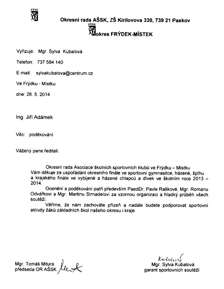 Poděkování od Asociace školních sportovních klubů ve Frýdku-Místku.