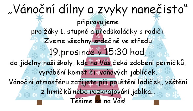 Zveme všechny srdečně ve středu 19.prosince v 15:30 hod. do jídelny naší školy, kde na Vás čeká zdobení perníčků, vyrábění komet či voňavých jablíček.