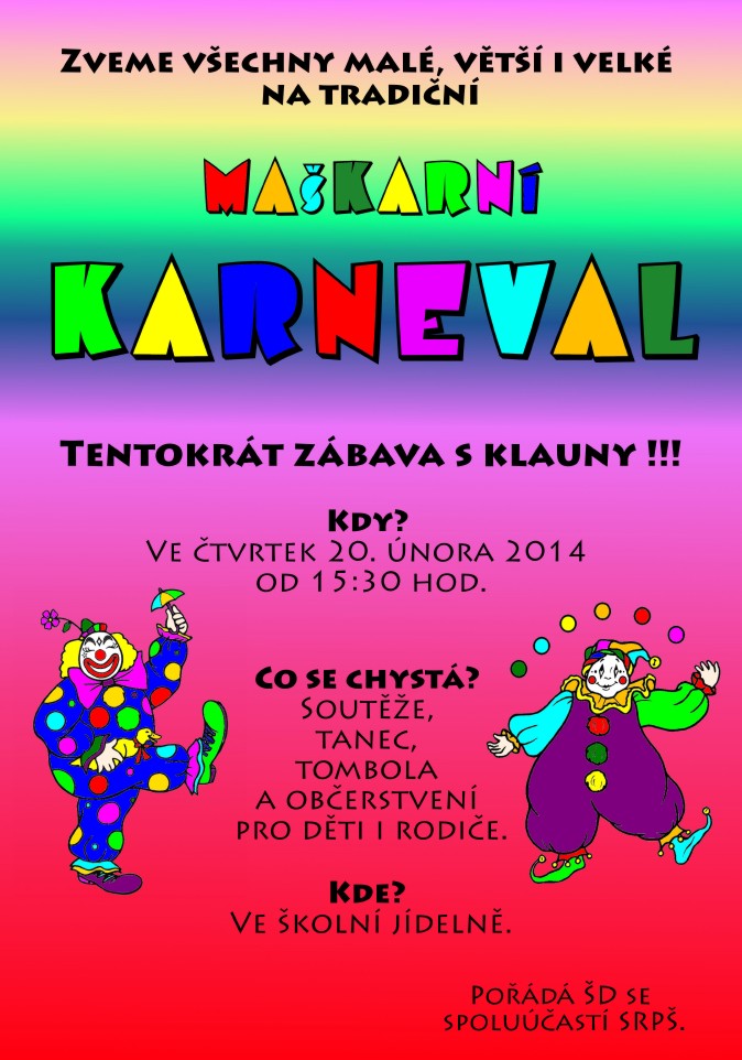 Zveme všechny malé, větší i velké na tradiční "Maškarní karneval", který se koná ve čtvrtek 20. února 2014 od 15:30 hod ve školní jídelně. Co se chystá?