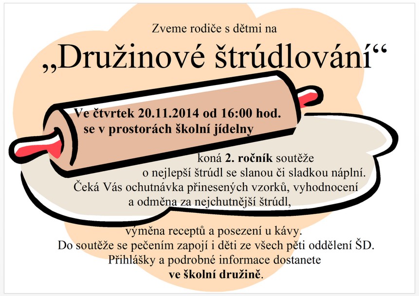 Ve čtvrtek 20.11.2014 od 16:00 hod. se v prostorách školní jídelny koná 2. ročník soutěže o nejlepší štrúdl se slanou či sladkou náplní. Čeká Vás ochutnávka přinesených vzorků, vyhodnocení a odměna za nejchutnější štrúdl, výměna receptů a posezení u kávy. Do soutěže se pečením zapojí i děti ze všech pěti oddělení ŠD. Přihlášky a podrobné informace dostanete ve školní družině.
