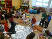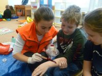 Děti se seznámily se základy první pomoci nejenom poslechem, ale měly možnost si vše "nanečisto" vyzkoušet. Dozvěděly se jak postupovat při bezvědomí, co udělat s krvácející ránou, zlomeninou, spáleninou, omrzlinou a jak se správně zachovat při podezření na úraz páteře. Děti se nechaly s nadšením  obvazovat a s chutí si vyzkoušely masáž srdce na figuríně.