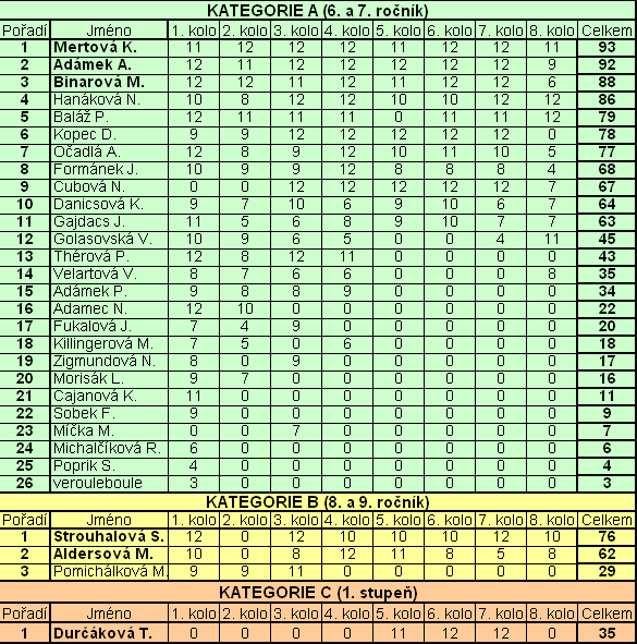 Ve čtvrtek 21. března proběhlo v učebně Informatiky závěrečné kolo zeměpisné soutěže Putování Českou republikou. Účastníci odpovídali stejně jako v minulých kolech na  soutěžní otázky pomocí map a internetu. Tentokrát  však byli na řešení náročných úkolů úplně sami. Vítězkou tohoto kola se stala v kategorii A (6.-7. třída) Kateřina Mertová, v kategorii B (8.-9.třída) Sára Strouhalová. Po sečtení výsledků všech osmi soutěžních kol zvítězila v kategorii A  Kateřina Mertová ze 6. B ziskem 93 bodů. Vítězkou kategorie B  se stala Sára Strouhalová z 8. B s 76 body. V kategorii 1. stupeň zvítězila Tereza Durčáková, která byla jedinou úspěšnou účastnicí této soutěže.                                       Všem vítězům blahopřejeme a těšíme se na jejich účast v dalších soutěžích. Při slavnostním vyhodnocení, které proběhne příští týden, obdrží vítězové hodnotné ceny.
