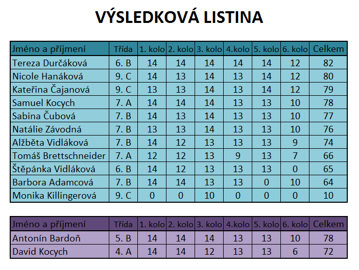 • 2. stupeň: Tereza Durčáková (6.B) - 82 bodů