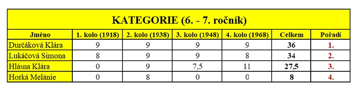V neděli 21. října skončilo 4. kolo dějepisné soutěže „Po stopách významných osmiček 20. století“. Všem zúčastněným děkujeme za vyřešení otázek, které se týkaly významných událostí naší novodobé historie. Nejúspěšnější řešitele najdete ve výsledkové tabulce.
