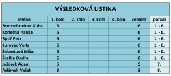 Celkové výsledky: 1. - 2. Michaela Tůmová, Magdaléna Adamcová – 28 b., 3. - 4. Kateřina Bánovská, Dominik Jurášek – 27 b., 5. - 6. Daniel Mach, Beáta Čubová – 24 b., 7. Richard Stalmach – 22 b., 8. – 10. Josef Matula, Daniel Dias, Alice Urbišová – 20 b., 11. Lucie Dudková – 19 b., 12. – 13. Tomáš Konečný, Melánie Horká – 18 b., 14. Dalibor Motyčka – 17 b., 15. Simona Lukáčová – 16 b., 16. – 17. Jakub Mandys, David Czap – 15.b.