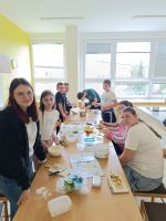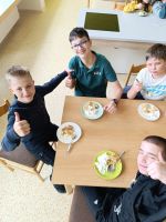 Děti pracovaly ve skupinkách podle receptu s anglickými instrukcemi a pečení je velmi bavilo. Největším zážitkem však byla závěrečná ochutnávka – koláč jsme podávali s vanilkovou zmrzlinou a všem se moc povedl.