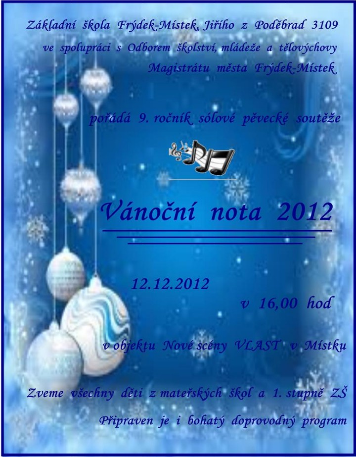 Naše základní škola na ulici Jiřího z Poděbrad ve spolupráci s Odborem školství, kultury, mládeže a tělovýchovy Magistrátu města Frýdek-Místek již podeváté připravila pěveckou soutěž určenou dětem mateřských škol a žákům 1. stupně nazvanou „Vánoční nota 2012“. Soutěž se uskuteční v překrásných prostorách Nové scény Vlast ve středu 12. prosince 2012 od 16.00 hodin.