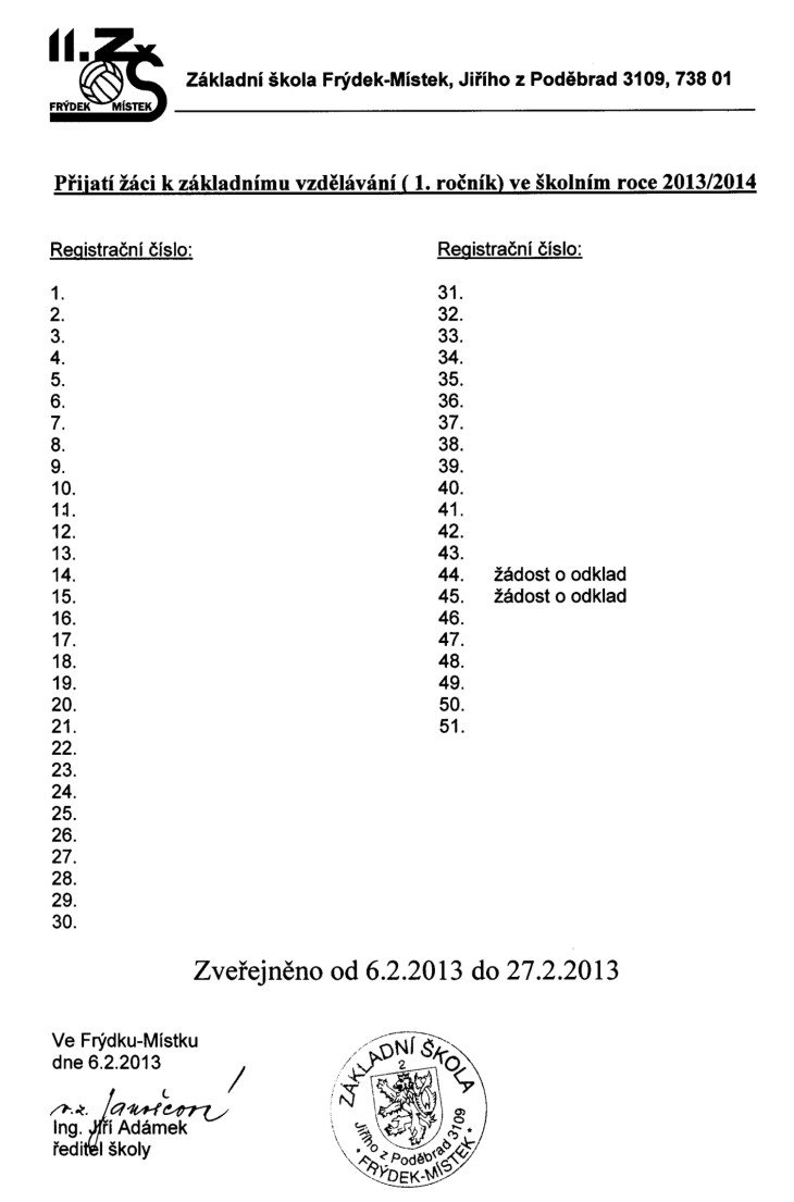 Seznam přijatých žáků do 1. ročníku ve školním roce 2013/2014