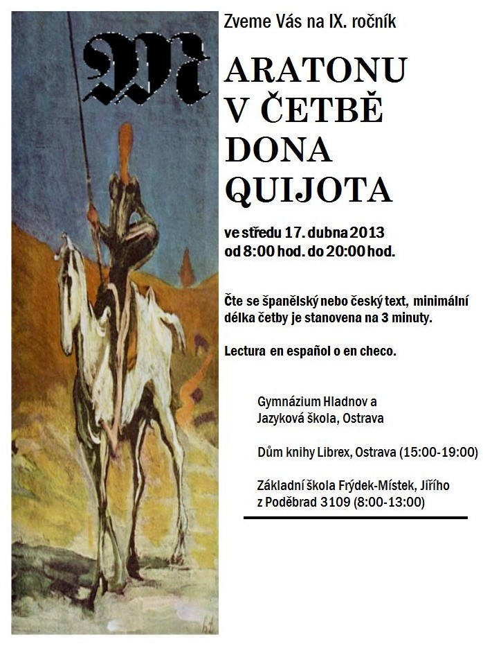 Dne 17.4.2013 se na naší škole uskuteční Maraton v četbě dona Quijota. Žáci se v hodinách českého a španělského jazyka seznámí se světoznámým autorem a jeho dílem. |