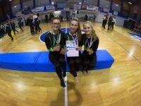 V závodě nám tentokrát soutěžilo i družstvo středoškolaček-nynějších trenérek v kategorii Senior Trio. V této kategorii není pódiová skladba a akrobacii s trampolínou skáčou pouze tři závodníci. Dívky se na tréninku mnohokrát nesešly, přesto nám vytřely zrak. Na akrobacii i trampolíně dokázaly získat hned druhou nejvyšší známku, kterou si zajistily stříbro v konkurenci devíti týmů. Nám tak připsaly na konto další krásný úspěch.
