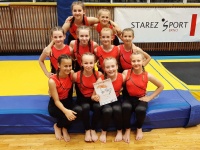 Tým dívek byl oslaben o dvě členky z důvodu nemoci, tudíž jsme museli mírně změnit pódiovou skladbu. Na akrobacii a trampolíně se předvedla i děvčata, která na předešlé soutěži v Třebíči nedostala příležitost, protože série skáče pouze šest nejlepších. Dívky odcvičily krásný závod. Zahájily na trampolíně, kde měly nejvyšší obtížnost z deseti týmů. Na počátku maličko zaváhaly, ale nakonec vše dopadlo tak, jak mělo. Trampolína se povedla bez pádu. Následovala pódiová skladba, kde v obtížnosti získaly druhou příčku. Provedení se rozhodčím nejspíše nelíbilo (nám sice ano), ale i přesto získaly krásnou známku. Akrobacie byla předvedena s jedním lehkým pádem, ale všechny ostatní skoky byly čisté a bezchybné. Dívky byly za povedený závod odměněny bronzovými medailemi.