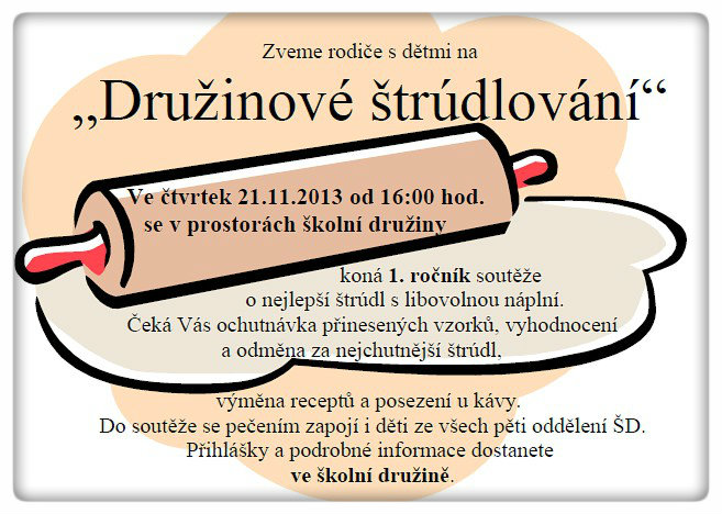 Ve čtvrtek 21.11.2013 od 16:00 hod. se v prostorách školní družiny koná 1. ročník soutěže o nejlepší štrúdl s libovolnou náplní. Čeká Vás ochutnávka přinesených vzorků, vyhodnocení a odměna za nejchutnější štrúdl, výměna receptů a posezení u kávy. Do soutěže se pečením zapojí i děti ze všech pěti oddělení ŠD. Přihlášky a podrobné informace dostanete ve školní družině