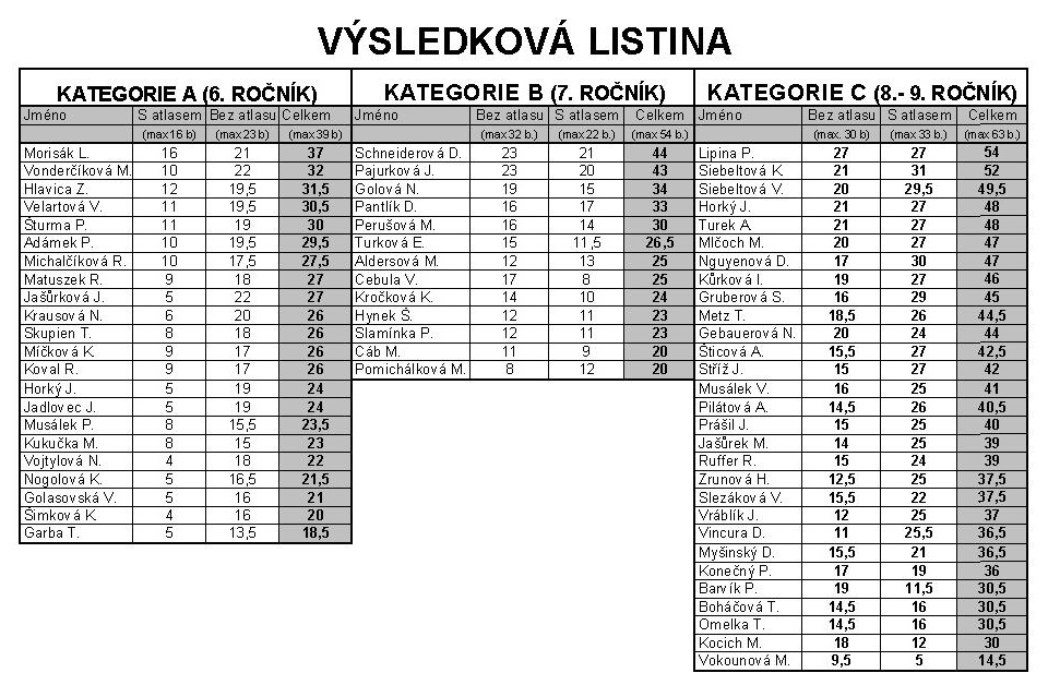 Ve čtvrtek 9. února 2012 proběhlo školní kolo Zeměpisné olympiády, které se zúčastnilo 64 žáků 6. - 9. tříd. Soutěž měla dvě části: práce bez atlasu a práce s atlasem. Nejlépe  si s náročnými otázkami poradili tito žáci: