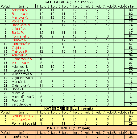 Poslední 8. kolo Putování Českou republikou proběhne ve čtvrtek 21. března v učebně Informatiky od 10:50 hod (4. vyučovací hodina). Soutěžící vypracují 10 otázek za pomocí internetu a dalších pomůcek, které si sami přinesou (encyklopedie, atlasy ...). Tohoto kola se mohou zúčastnit soutěžící, kteří prošli minimálně polovinou soutěžních kol (jsou v tabulce označeni červeně).