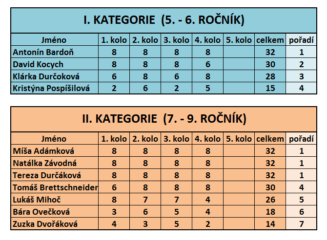 ZÁVĚREČNÉ KOLO PROBĚHNE V ÚTERÝ 11. DUBNA V UČEBNĚ INFORMATIKY 1. - 2. VYUČOVACÍ HODINU