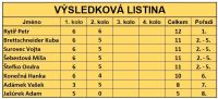 Celkové výsledky: 1. - 2. Michaela Tůmová, Magdaléna Adamcová – 28 b., 3. - 4. Kateřina Bánovská, Dominik Jurášek – 27 b., 5. - 6. Daniel Mach, Beáta Čubová – 24 b., 7. Richard Stalmach – 22 b., 8. – 10. Josef Matula, Daniel Dias, Alice Urbišová – 20 b., 11. Lucie Dudková – 19 b., 12. – 13. Tomáš Konečný, Melánie Horká – 18 b., 14. Dalibor Motyčka – 17 b., 15. Simona Lukáčová – 16 b., 16. – 17. Jakub Mandys, David Czap – 15.b.