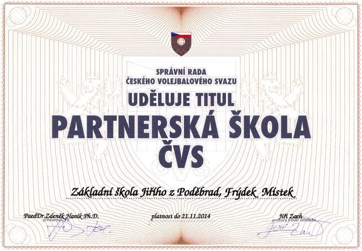 Dne 21.11.2012 byl vedení 11 ZŠ za přítomností primátora Mgr. Petra Cvika,  Ing. Ilony Nowakové vedoucí odboru ŠKMaT Magistrátu města Frýdku-Místku,  starosty Sokola Frýdek-Místek Jiřího Zaorala, předán  předsedou Českého volejbalového svazu PaedDr. Zdeňkem Haníkem Ph.D škole titul Partnerská škola ČVS.