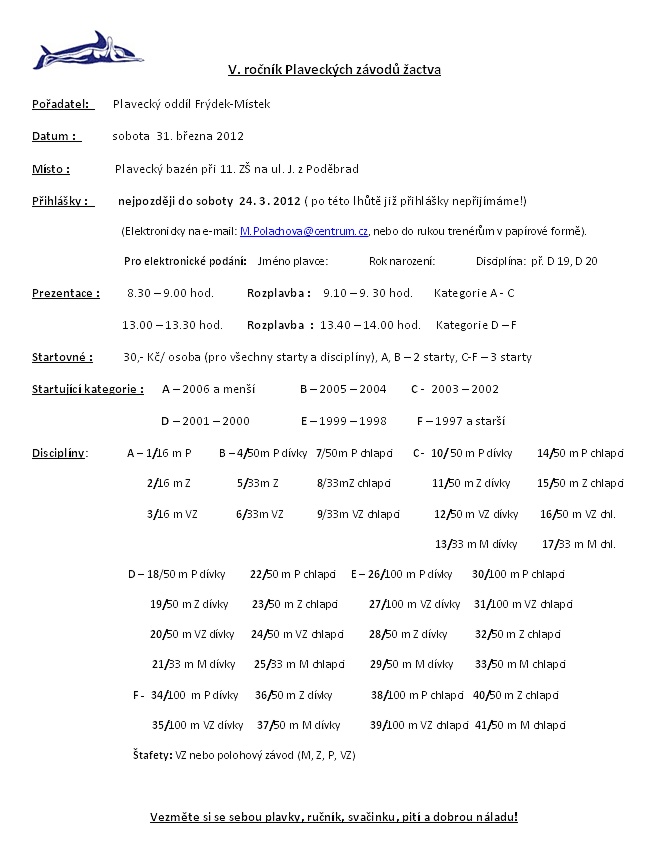 V sobotu 31. března 2012 pořádá Plavecký oddíl Frýdek-Místek V. ročník Plaveckých závodů žactva.
